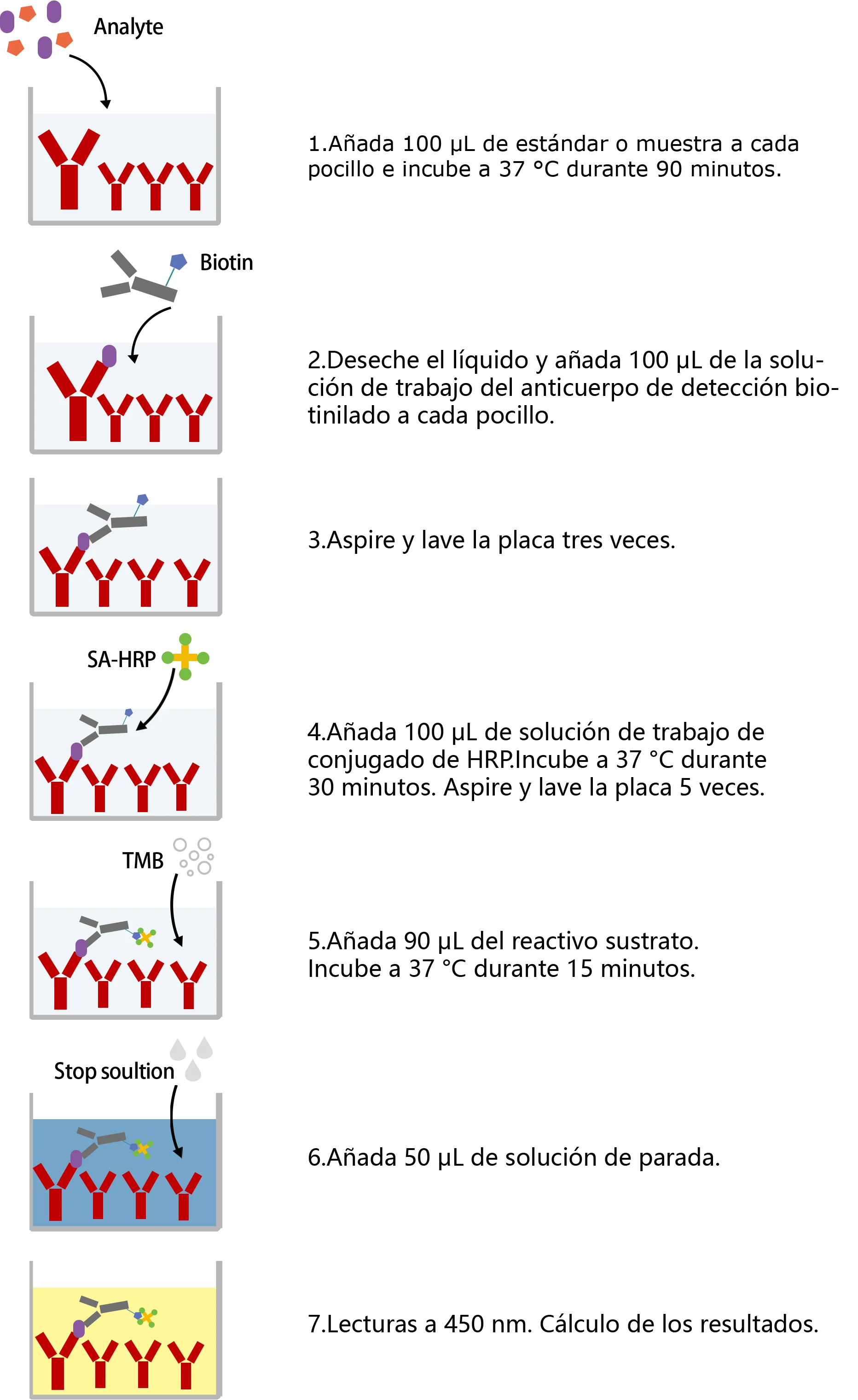 | Microplaca | 96T: 8 wells×12 strips 48T: 8 wells×6 strips | No abierto: -20°C, 12 meses No utilizado: Devolverlo a la bolsa de papel aluminio y sellarla, almacenar a -20°C. |